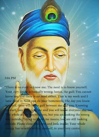 “There is no need to know me; The need is to know yourself; Your very desire is basically wrong; hence, the gulf; You cannot know me, and there is no need either; That is my work and I have done it; Now you do your homework; The day you know yourself, there will be no gulf between me and you; Knowing yourself, you will know me and you will know everyone else too; The whole secret is within you, but you are looking the wrong way outside; Trying to know me means, you are still looking outside; Please close your eyes and look inside; Your whole energy has to settle within yourself, in your very centre.”